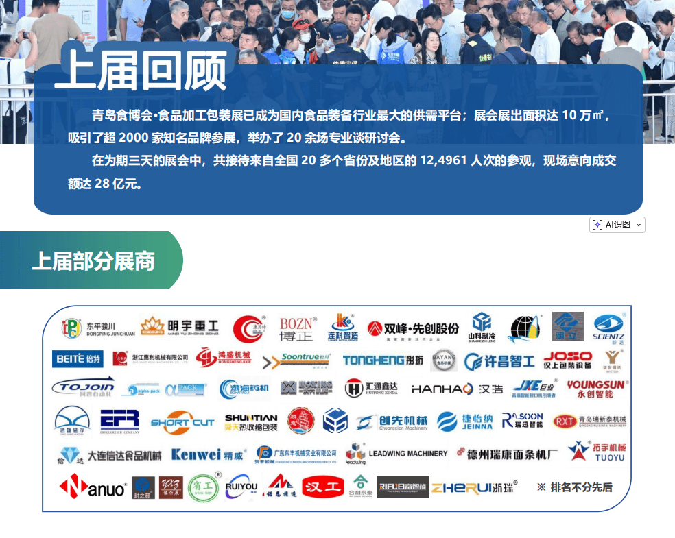 • “鲁食智制”从题馆:集中展现山东本土立异配备,如海产物智能分选线种海洋生物)、智能煎饼鏊子出产线%)。建立全球供需曲通车,预制菜设备专区吸引200+新锐企业。 ✅ 区位劣势:青岛是“一带一”枢纽城市、国际口岸商业核心,长三角,辐射全国90%焦点食物财产带,海陆空交通便当,3小时笼盖东三省、京津冀、江浙沪等经济圈。 昌大举办。2026青岛食物机械展以“数智赋能食物财产,立异驱动包拆升级”为从题,汇聚全球食物加工取包拆机械范畴的最新手艺、设备及处理方案,影响力最强的食物机械行业嘉会。 2026青岛食物加工取包拆机械博览会不只是全球食物机械企业展现立异手艺的舞台,更是行业趋向的风向标、商贸合做的高效平台。 • 20+场行业峰会:聚焦无人工场、低碳包拆、切磋绿色节能手艺(如热能收受接管、环保制冷)取数字化转型径。 本届展会合中展现无人工场、智能食物加工、高效包拆设备、5G使用等食物配备行业最尖端的手艺及,鞭策食物机械向从动化、数字化、智能化标的目的成长。 2026青岛食物机械展由食物工业协会结合从办,青岛蓝博国际会展无限公司承办,估计展出头具名积14万平方米,吸引2500+全球参展商,展出3000+项立异手艺及设备,涵盖食物加工、智能包拆、从动化出产线、冷链物流等全财产链处理方案。 • 智能加工设备:AI视觉检测、工业物联网(IoT)、5G智能节制手艺,实现出产全流程智能化。 5月29-31日,青岛红岛国际会展核心,诚邀全球食物工业同仁共赴嘉会,共启智能食物机械新时代!